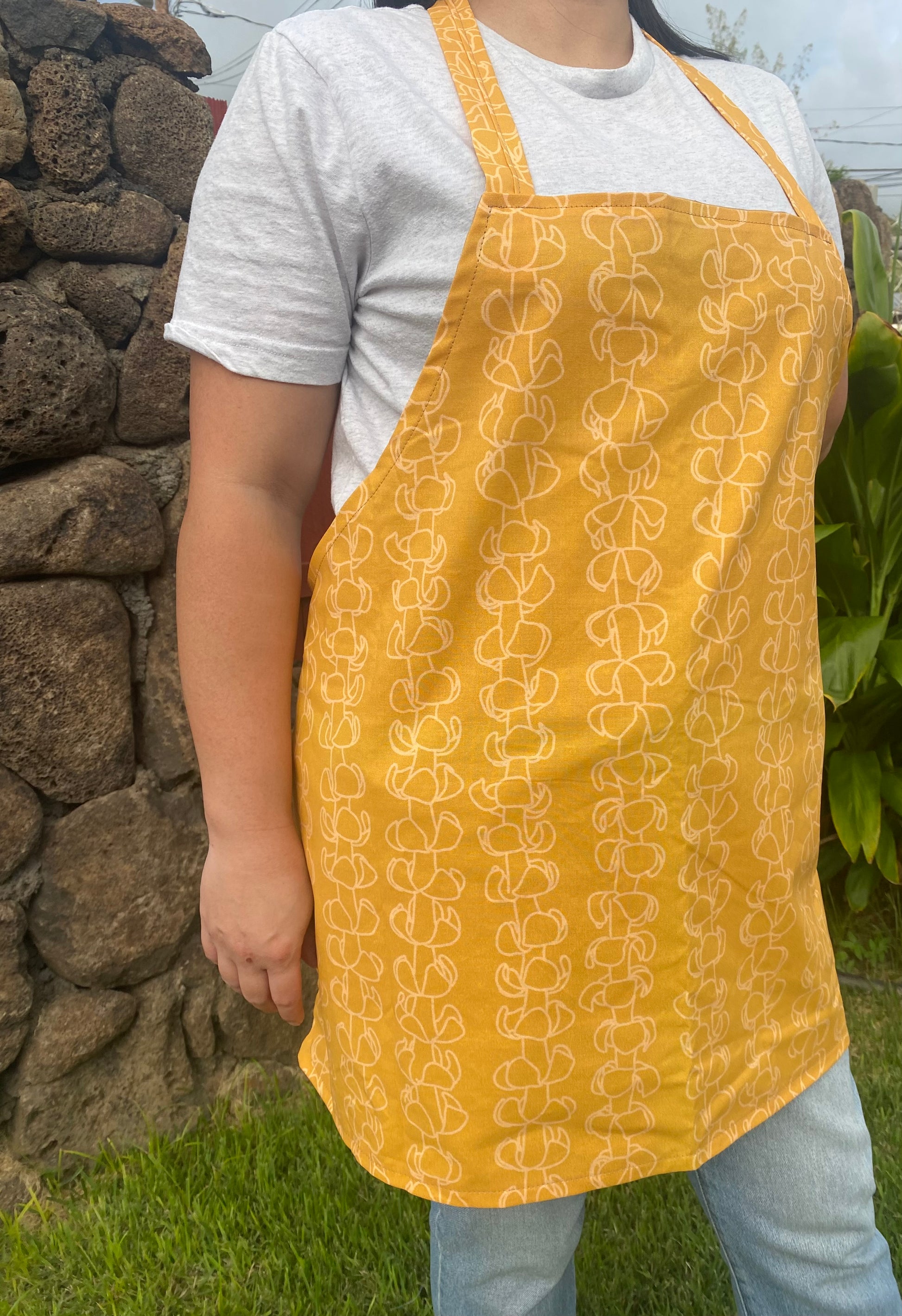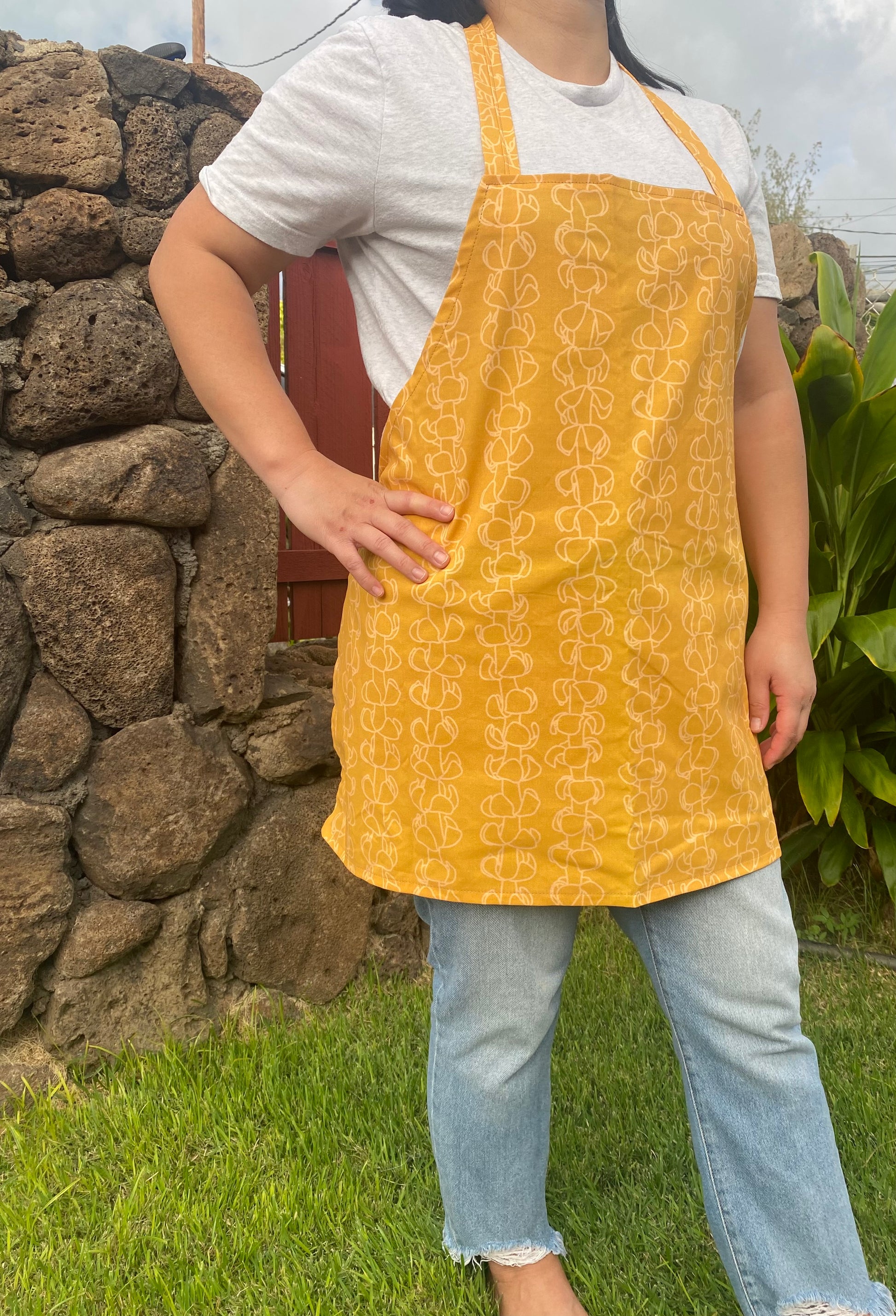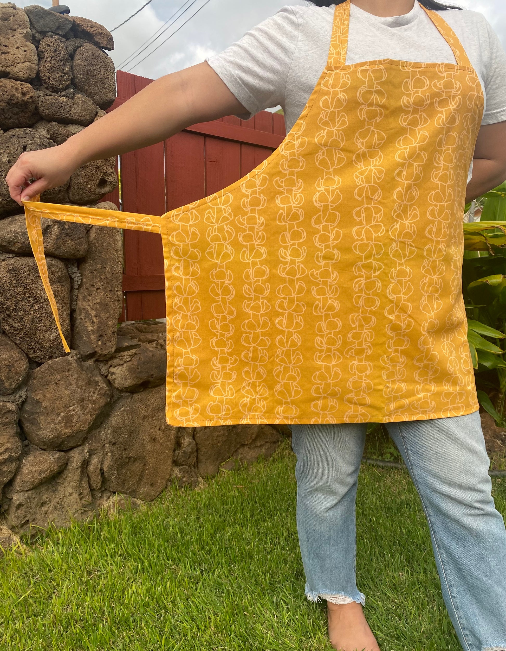Our aprons are made with cotton fabric. Machine wash cold with like colors on a gentle cycle. Hang dry or tumble dry on low.